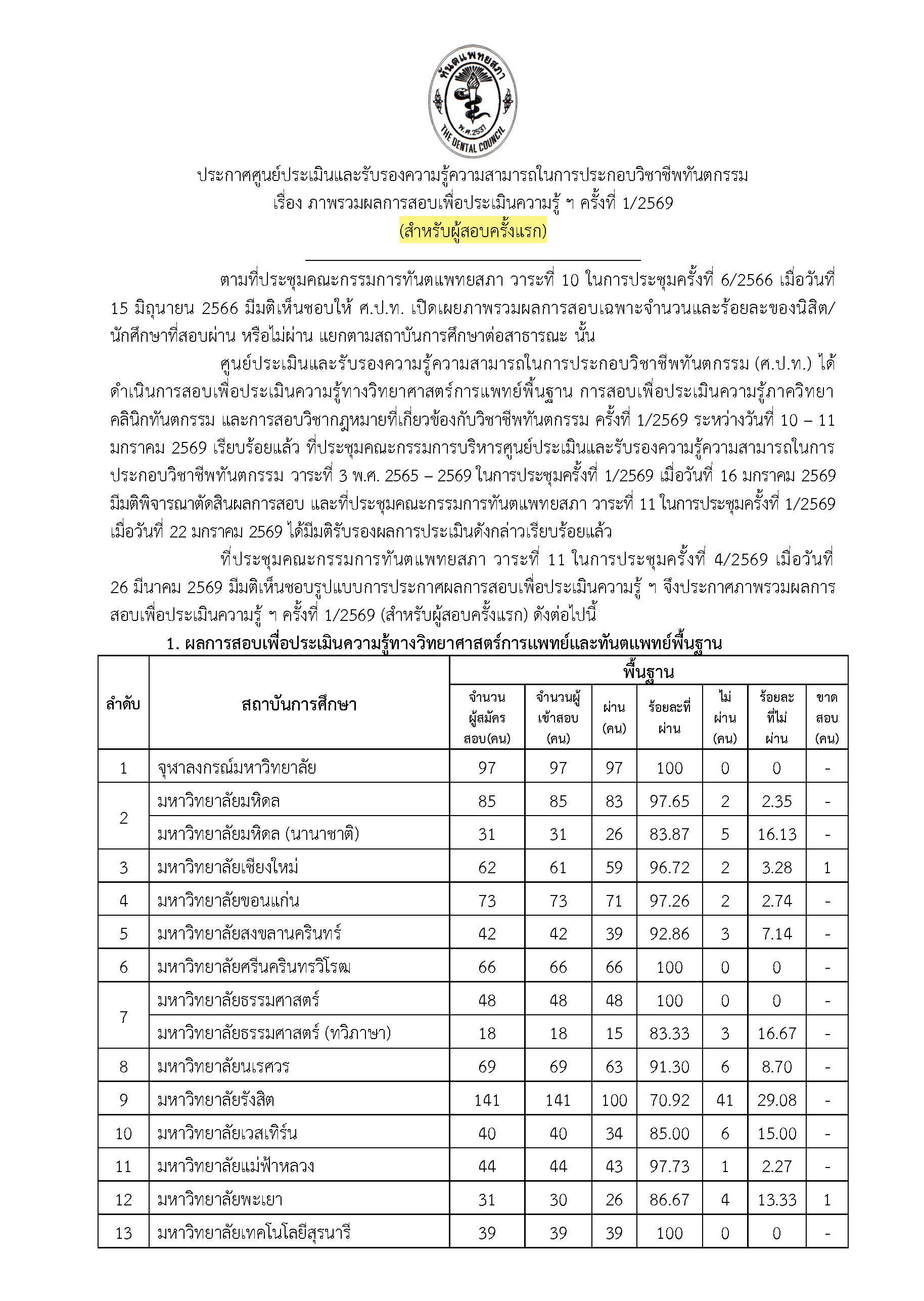ประกาศศูนย์ประเมินและรับรองความรู้ความสามารถในการประกอบวิชาชีพทันตกรรม เรื่อง ภาพรวมผลการสอบเพื่อประเมินความรู้ ฯ ครั้งที่ 1/2569 สำหรับผู้เข้าสอบครั้งแรกและสำหรับผู้เข้าสอบครั้งที่สองขึ้นไป