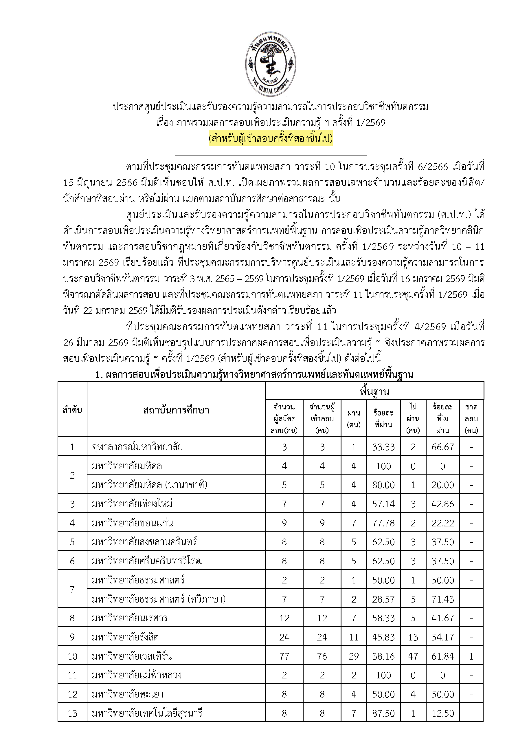 ประกาศศูนย์ประเมินและรับรองความรู้ความสามารถในการประกอบวิชาชีพทันตกรรม เรื่อง ภาพรวมผลการสอบเพื่อประเมินความรู้ ฯ ครั้งที่ 1/2569
