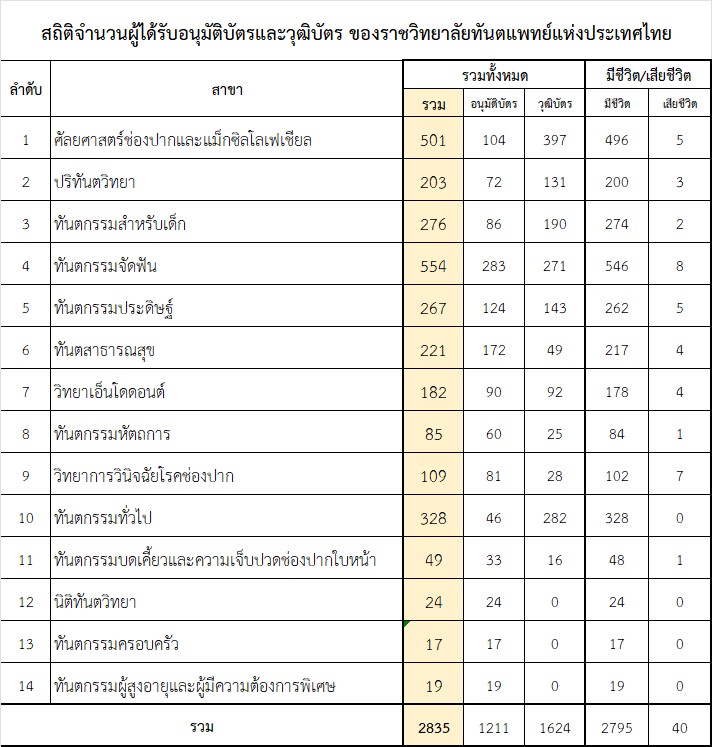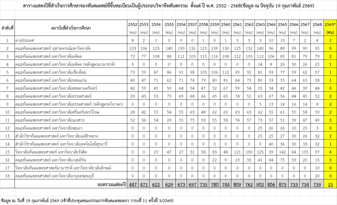 • สถิติจำนวนผู้ได้รับอนุมัติบัตรและวุฒิบัตรของราชวิทยาลัยทันตแพทย์แห่งประเทศไทย (ข้อมูล ณ วันที่ 19 กุมภาพันธ์ 2569)