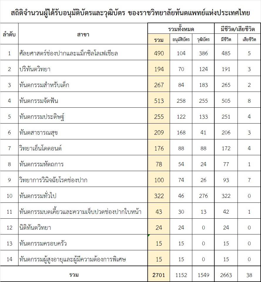 • สถิติจำนวนผู้ได้รับอนุมัติบัตรและวุฒิบัตรของราชวิทยาลัยทันตแพทย์แห่งประเทศไทย (ข้อมูล ณ วันที่ 18 กันยายน 2568)