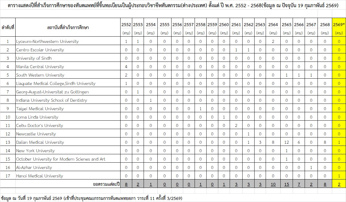 • จำนวนทันตแพทย์ที่ขึ้นทะเบียนเป็นผู้ประกอบวิชาชีพทันตกรรม(ต่างประเทศ) ตั้งแต่ ปี พ.ศ.2552 - ปัจจุบัน (ข้อมูล ณ วันที่ 19 กุมภาพันธ์ 2569)