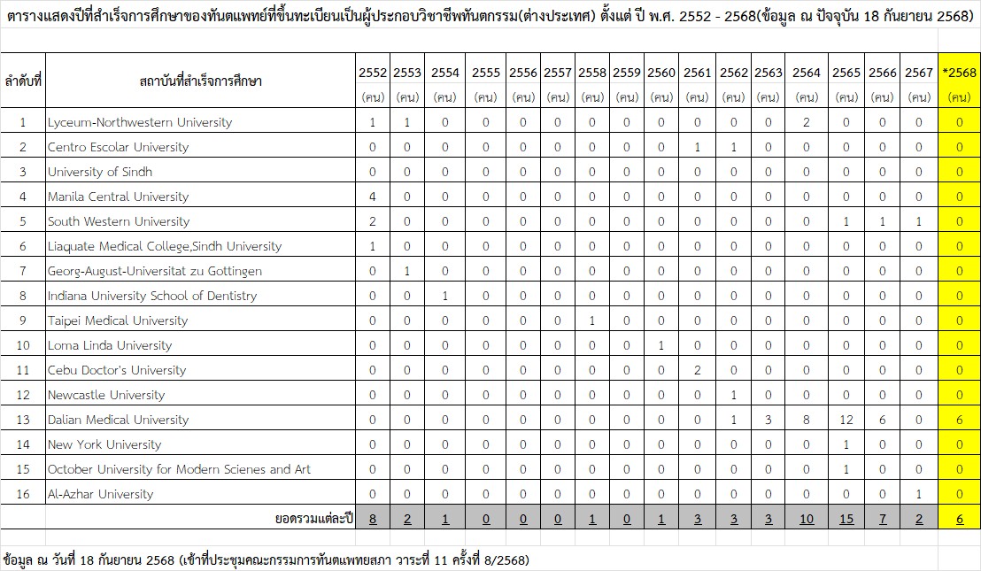 • จำนวนทันตแพทย์ที่ขึ้นทะเบียนเป็นผู้ประกอบวิชาชีพทันตกรรม(ต่างประเทศ) ตั้งแต่ ปี พ.ศ.2552 - ปัจจุบัน (ข้อมูล ณ วันที่ 18 กันยายน 2568)