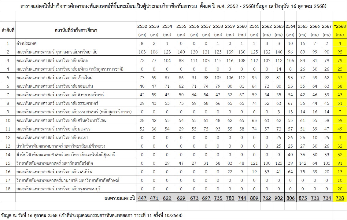 • จำนวนทันตแพทย์ที่ขึ้นทะเบียนเป็นผู้ประกอบวิชาชีพทันตกรรม ตั้งแต่ ปี พ.ศ.2552 - ปัจจุบัน (ข้อมูล ณ วันที่ 16 ตุลาคม 2568)