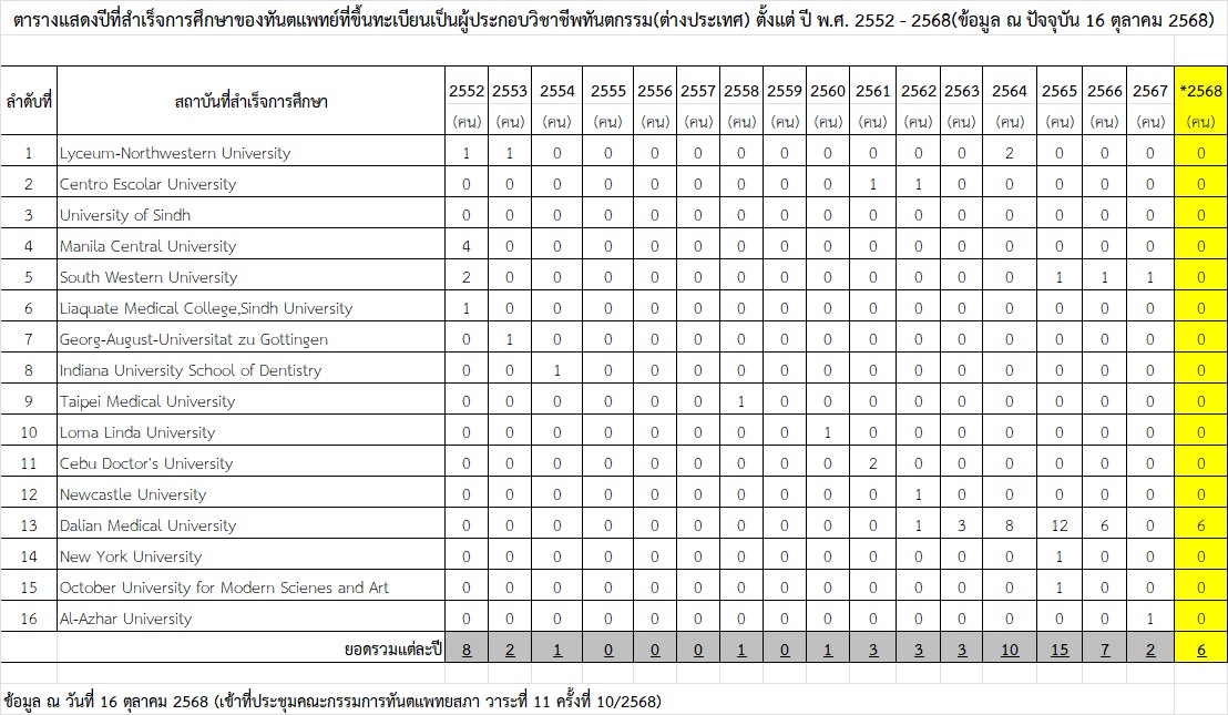 • จำนวนทันตแพทย์ที่ขึ้นทะเบียนเป็นผู้ประกอบวิชาชีพทันตกรรม(ต่างประเทศ) ตั้งแต่ ปี พ.ศ.2552 - ปัจจุบัน (ข้อมูล ณ วันที่ 16 ตุลาคม 2568)